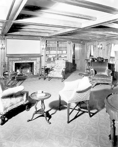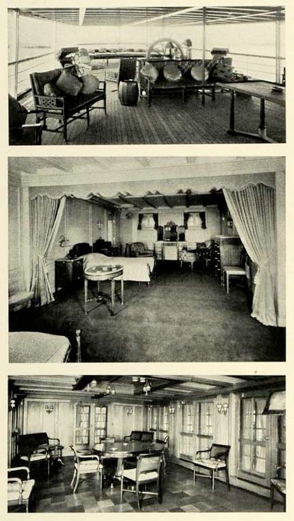 Above are several interior views of Johnson's yacht. Visible in the living room is a Steinway Duo-Art piano in an elaborate art case. Behind the piano is what appears on first look to be a large Victrola . On closer inspection it turns out to be a illusion created by the way the drapes are hanging.